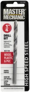 Master Mechanic, 1/4" x 4", M50, High Speed Steel Drill Bit, 118 Point, Bright Silver Finish, Jobber Length, Standard Shank, Features 2 Cutting Edges & Polished Flutes, Recommended For Drilling Wood, Plastic, Wallboard & Plywood, For Moderate Use In Soft Metal, Brass, Bronze, Sheet Metal & Aluminum .