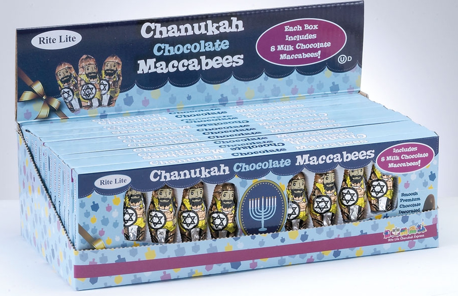 A delicious Chanukah novelty! Milk Chocolate Maccabees sweeten your celebration of Chanukah with 8 Maccabees in an artistic Chanukah-themed package! Smooth Milk Chocolate shapes are wrapped in a full color Maccabee foil design.